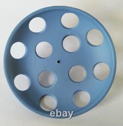 A Wedgwood blue jasperware potpourri pot and lid featuring white bas reliefs. The pot measures approximately 4 3/4 inches in diameter and stands around 2 inches tall plus the lid. The pot is stamped'Wedgwood Made in England' on its base. The pot has been previously owned, it is first quality and is in very good condition.