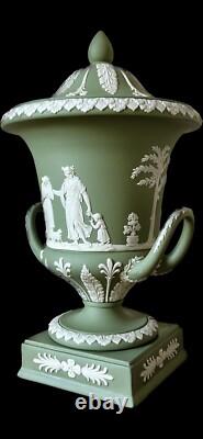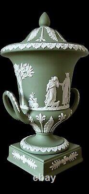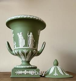 Wedgwood Jasperware Campana Urn Vase with lid and handles. Sage Green with white bas-relief scenes from Greek mythology. Excellent condition with no chips or other defects.