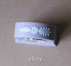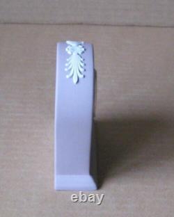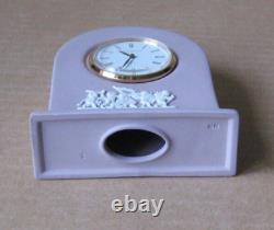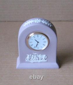 Wedgwood Lilac Jasperware Small Dome Clock. Depicts a front cupid/putti scene and a daisy design at the top in white jasper - clock face has a gold metal around it and is stamped "Wedgwood Quartz" - back is stamped "Wedgwood Made in England" - base stamped HR. Approximate Size - 7cm/2.75" across base - 2.5cm/1" deep - 8.56cm/3.25 Tall. Good condition, no chips, cracks or repairs - new battery and mechanism works well.