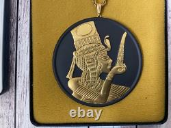 WEDGWOOD RARE JASPER JASPERWARE GOLD ON BLACK TUTANKHAMEN AND QUEEN ANKHESENAMUM PENDANTS BOXED. IN GOOD CONDITION NO CHIPS OR CRACKS, FULLY STAMPED WEDGWOOD MADE IN ENGLAND. DIAMETER OF 4.5CM WITH CHAIN.
