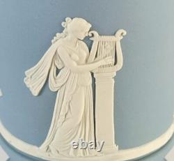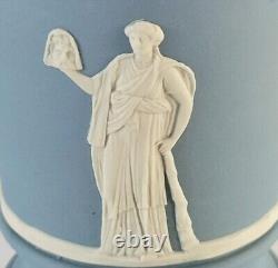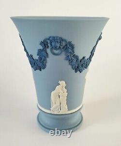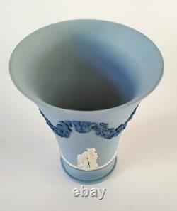 Tri Colour Lion Head and Garland Vase. A Wedgwood tricolour jasperware vase featuring white bas-reliefs and a portland blue bas-reliefs of a lions head on each side along with a vine garland. The vase measures approximately 4 3/4 inches in diameter and stands approximately 6 inches tall. The vase is stamped'Wedgwood Made in England' on its base.