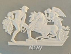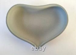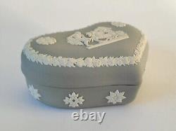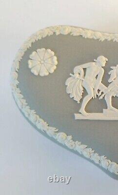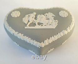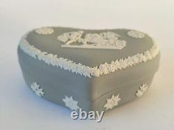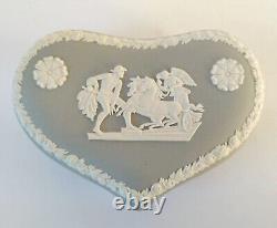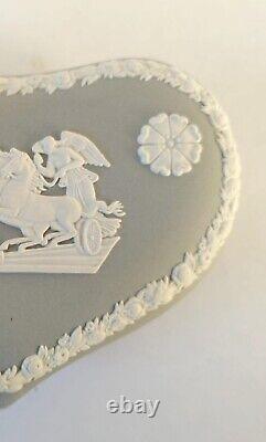 Boîte à Bijoux en Coeur en Jasperware Gris Ulysses Arrêtant le Char de la Victoire avec Couvercle. Une boîte à bijoux en forme de cœur en jasperware gris Wedgwood classique avec des bas-reliefs blancs représentant une scène néoclassique sur le couvercle de 'Ulysses Arrêtant le Char de la Victoire'. La boîte mesure environ 5 pouces par environ 1 3/4 pouces de profondeur.