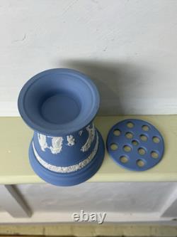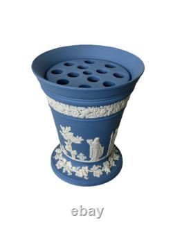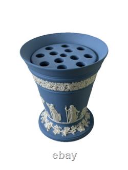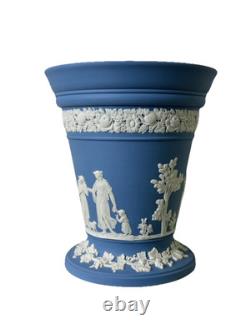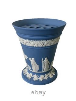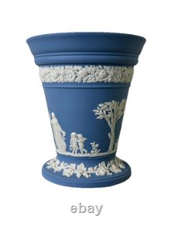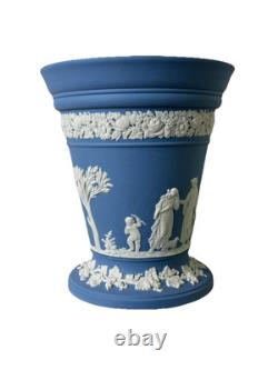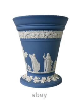 Fabriqué au cœur du Staffordshire, ce vase élégant en Jasperware Wedgwood se dresse comme un témoignage de l'art intemporel du style néoclassique. Décrivant des scènes de la Grèce antique, cette pièce est une véritable incarnation du savoir-faire historique, complète avec l'insert de grenouille d'origine qui renforce son authenticité. Avec une hauteur majestueuse de 17 cm et une largeur de 15,5 cm, ce vase de couleur bleue est une représentation frappante du design du milieu du 20e siècle. Le vase arbore un timbre arrière en relief, confirmant son originalité et sa technique de production en poterie.