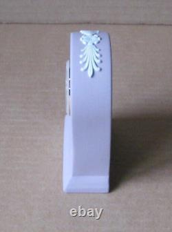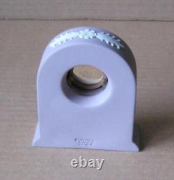 Horloge en dôme petite en jasper lilas Wedgwood. Représente une scène de cupidon/putti à l'avant et un motif de marguerite en haut en jasper blanc - le cadran est entouré de métal doré et est estampillé "Wedgwood Quartz" - le dos est estampillé "Wedgwood Made in England" - la base est estampillée HR. Taille approximative - 7 cm/2,75" de large à la base - 2,5 cm/1" de profondeur - 8,56 cm/3,25" de hauteur. Bon état, pas d'ébréchures, de fissures ou de réparations - nouvelle batterie et mécanisme fonctionne bien.
